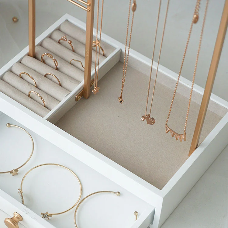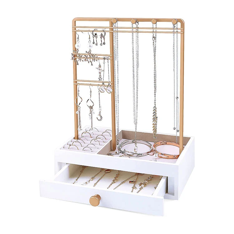 Отворена площ на дисплея на горния слой: Златна метална рамка, подходяща за окачване на колиета, обеци и гривни. Лесно се вижда и може да бъде достъпен при необходимост.