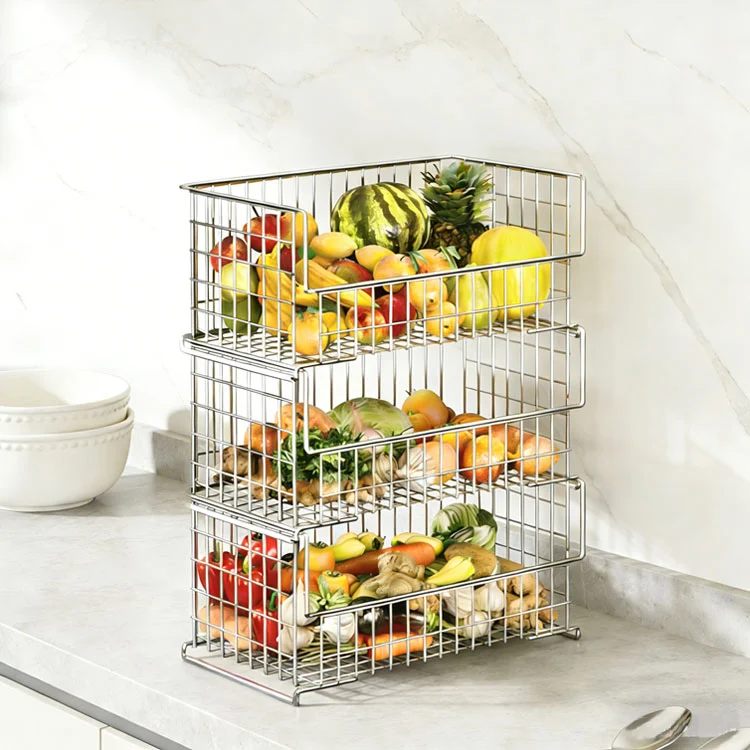 1. Структурни характеристики: Приема модулен дизайн, който позволява свободно подреждане. Една кошница може да се използва независимо, а когато са подредени няколко кошници, те могат да бъдат точно позиционирани чрез долните скоби, за да се предотврати плъзгане и преобръщане. Корпусът на кошницата с отворена решетка, съчетан с повдигнатия ръб на кошницата, може да предотврати търкалянето на плодовете и зеленчуците, като същевременно поддържа циркулацията на въздуха и намалява вероятността от разваляне и влошаване на храната.